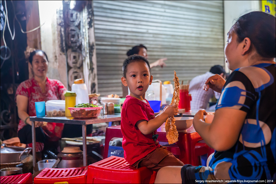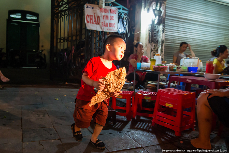 Многие приходят с детишками, которые сломя голову носятся между столиков и сидящих за ужином вьетнамцев.