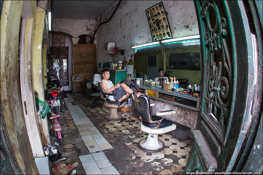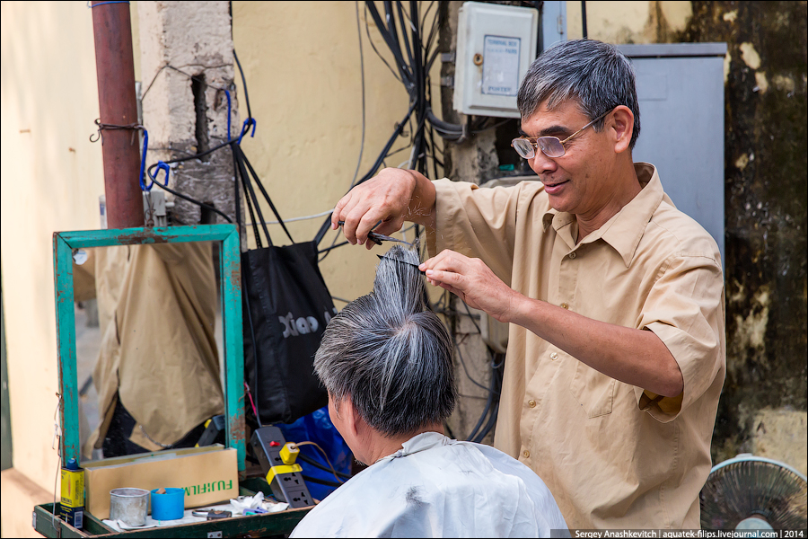 В Ханое просто огромное количество вот таких уличных цирюлен. Кстати, в них не только стригут, но и могут побрить бороду.