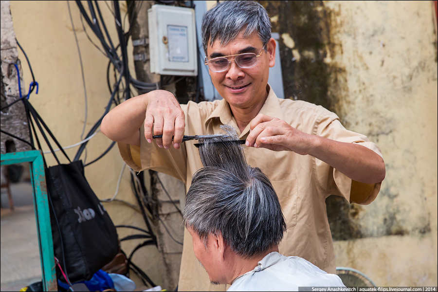 Вот уж где точно во Вьетнаме можно вкусить экзотики, так это в уличных парикмахерских. Нет, конечно, есть и вполне приличные салоны с красивыми вывесками и улыбчивыми вьетнамками, орудующими ножницами, но там цена за стрижку может доходить до 100 донгов (5 долларов), что очень дорого для простых вьетнамцев. Поэтому за 2 доллара можно постричься в hair-салоне, а за 1 доллар прямо на улице...