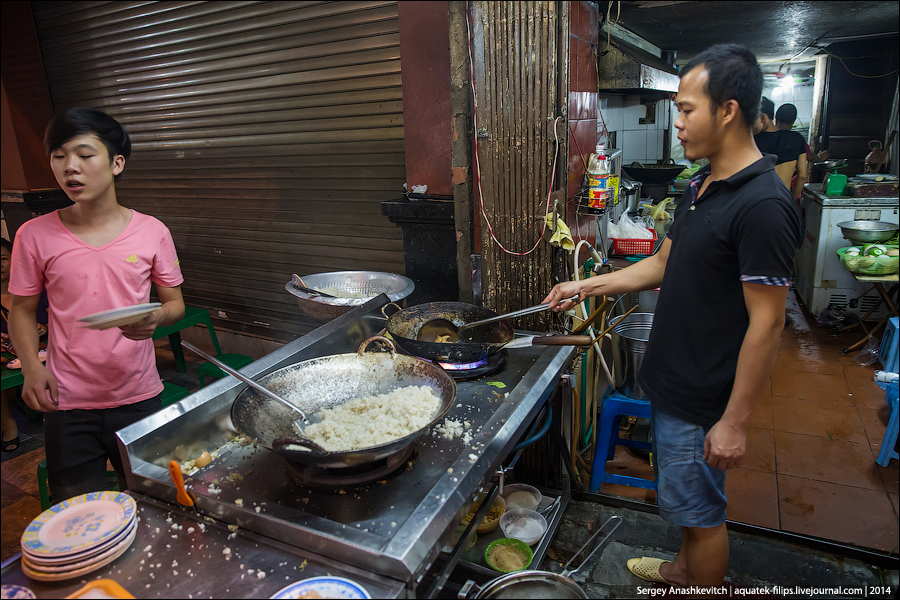 А теперь поговорим об уличных забегаловках. У нас бы их закрыли моментально, но не во Вьетнаме. Здесь всем совершенно наплевать на то, в каких условиях готовится еда и в каких условиях ее придется есть. Здесь главное, чтобы все это происходило на как можно более людной улице. Есть прямо на улице для вьетнамцем что-то вроде фетиша. В своих домах они практически не едят, норовят обязательно выйти со своим супом фо или миской рисовой лапши на людную улицу. И уже там уплетают еду за обе щеки, глазея по сторонам и переговариваясь со знакомыми и совершенно посторонними людьми. Поэтому уличные заведения в этой стране процветают - вечером в них, как правило, яблоку негде упасть. Несмотря на всю грязь и треш.