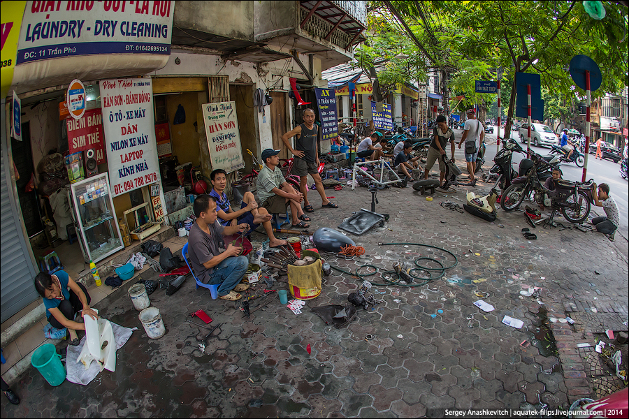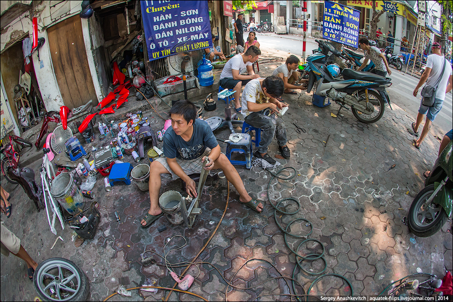Ханойские улицы полны не только торговцев, но и разного рода ремесленников. Здесь можно встретить кого угодно - от обувщиков до фрезеровщиков с выставленными на улицу станками, от мастеров уличного массажа до резчиков по камню, изготавливающих надгробные таблички.