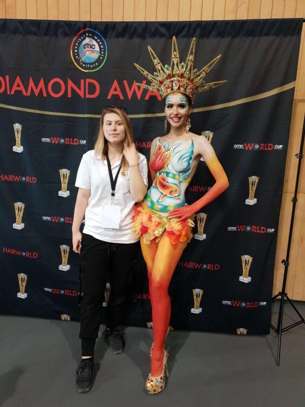 Соотечественница Анастасия Евстегнеева превратила красавицу Анастасию Варламову в золотую рыбку золотистых, алых и голубых оттенков. Эту работу жюри посчитало самой лучшей. К тому же Евстегнеева получила два третьих места за подиумный и свадебный макияж.
