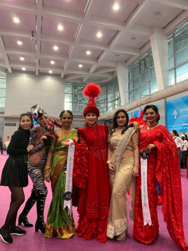 Арай Алимхан на конкурсе представила красное бархатное платье в национальном стиле. Вышитые бисером орнаменты и высокое саукеле на ней смотрелись весьма оригинально. Жительница Нур-Султана предстала настоящей казахской невестой.