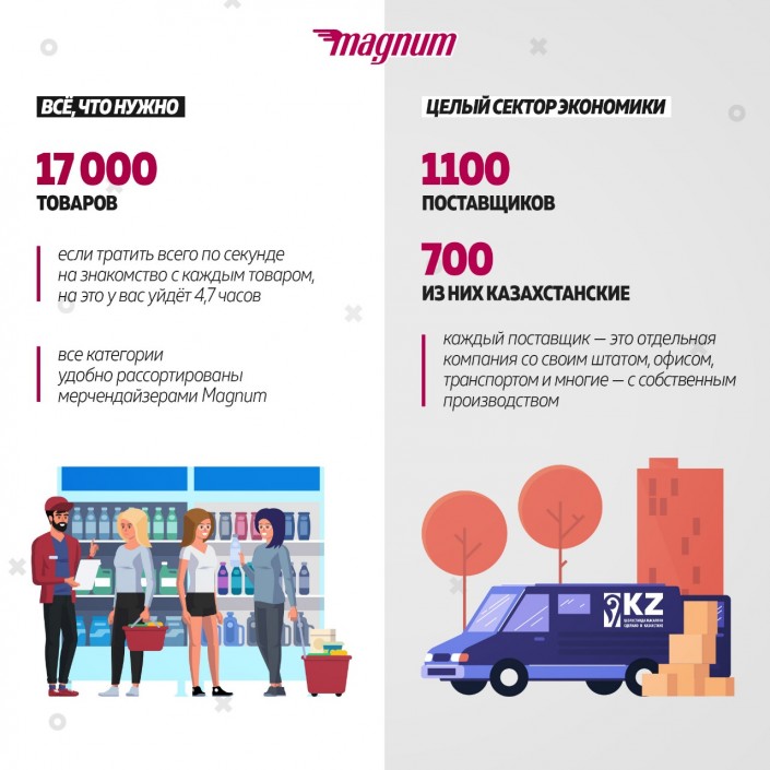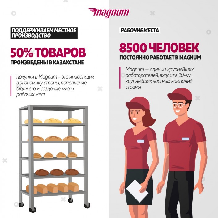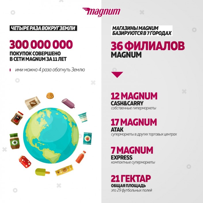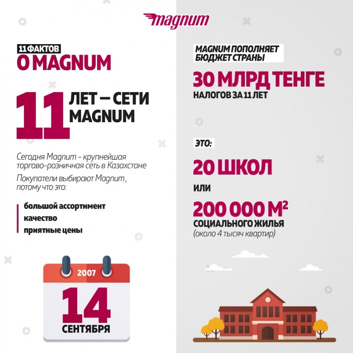 Компании Magnum Сash&Carry исполнилось 11 лет. 14 сентября 2007 года в Алматы был открыт первый магазин сети формата Сash&Carry (от английского "заплати и уноси" - формат магазинов самообслуживания). С латыни Magnum переводится как "большое, великое", и сегодня торгово-розничная сеть полностью соответствует своему названию. За прошедшие годы она стала крупнейшей в Казахстане и продолжает динамично развиваться благодаря своим любимым покупателям, выбирающим большой ассортимент, качество и цены от Magnum.