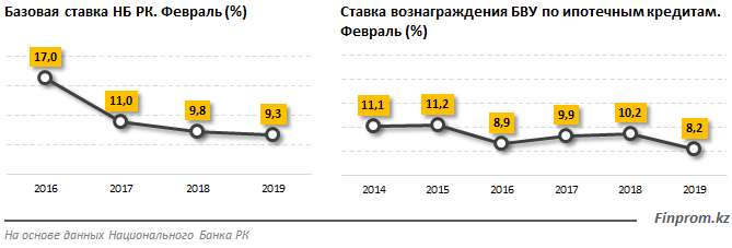По состоянию на март 2019 года базовая ставка Нацбанка РК равна 9,25 процента. В 2018 году регулятор снижал ставку три раза в течение года, что позитивно повлияло на ставку вознаграждения БВУ по ипотечному кредитованию. Это в свою очередь также должно стимулировать кредитный рынок. На конец февраля 2019 года средневзвешенная ставка вознаграждения БВУ по ипотеке составила 8,2 процента, в прошлом году - 10,2 процента: снижение сразу на 2 процентных пункта.