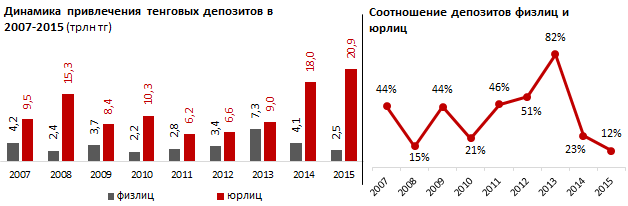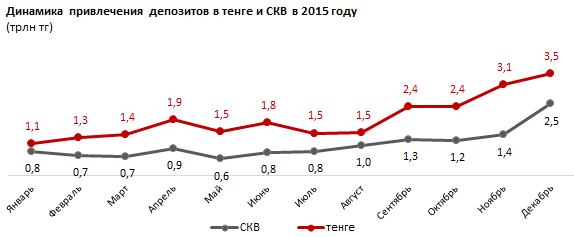 При этом, по их информации, в декабре 2015 года вклады клиентов банков пополнились сразу на 3,5 триллиона тенге, и это является историческим максимумом привлечения вкладов за месяц в РК. "Основной объем привлечения был обеспечен со стороны корпоративных клиентов БВУ, которые за 2015 год внесли порядка 20,9 триллиона тенге, или 88 процентов всех тенговых депозитов", - пояснили аналитики.