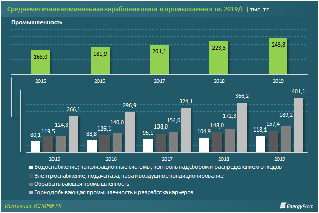 Для сравнения, в первом квартале 2019 года среднемесячная номинальная заработная плата работников промышленной отрасли составила 243,8 тысячи тенге, увеличившись на 9,2 процента за год. С учетом инфляции покупательская способность заработных плат в секторе выросла на 4 процента.