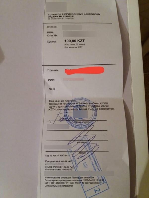 "Өзіме ұсақ ақша керек дедім. 20 мыңды алып, комиссия 100 теңге болады деді. Квитанция берді, қол қойдым", - деп баяндады қолданушы оқиғасын.