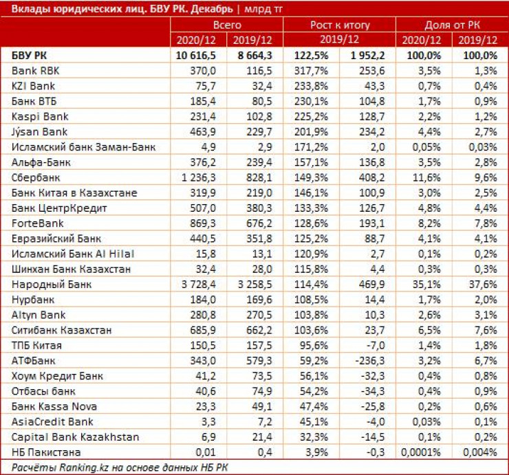По итогам 2020 года Bank RBK более чем утроил портфель вкладов бизнес-клиентов. По темпам роста этого показателя банк стал абсолютным лидером среди банков Казахстана, сообщает Ranking.kz.