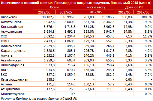 В обоих регионах-инвестмагнитах объемы инвестиций в основной капитал в сфере производства продуктов питания выросли более чем в 3,3 раза за год - до 11,9 миллиарда тенге в Алматинской и до 5,7 миллиарда тенге в Костанайской областях.