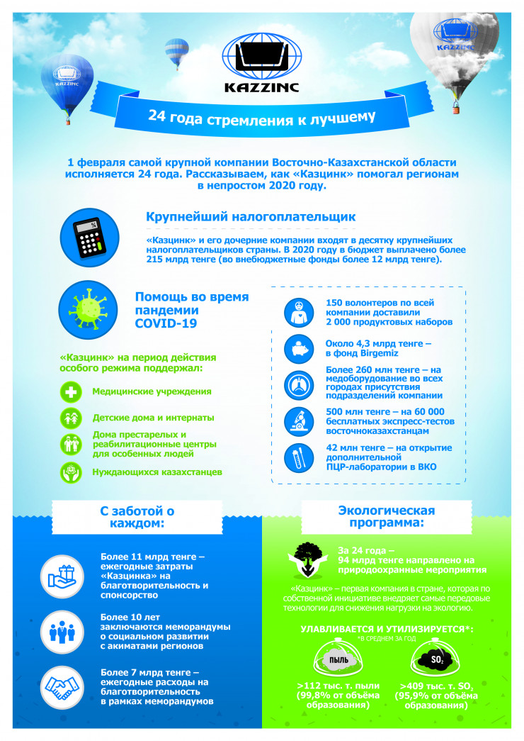 1 февраля самой крупной компании Восточно-Казахстанской области исполняется 24 года. Рассказываем, как "Казцинк" помогал регионам в непростом 2020 году.