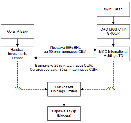 Как пояснил глава пресс-службы БТА Банка Эльдар Шамсутдинов, Blackdesert Holdings Ltd, владевшая правами на землю, где строилась башня "Евразия", принадлежала на 50 процентов подконтрольной БТА Банку Handcart Investments Limited и на 50 процентов - MCG International Holding LTD Павла Фукса. В 2009 году Аблязов продал свою долю, однако MCG перевела только первый транш в сумме 20 миллионов.