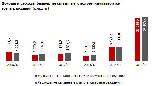 Также отмечается, что доходы и расходы банков, не связанные с выплатой вознаграждения, в 2015 году резко возросли. Так, свыше 80 процентов в этих показателях приходятся на доходы и расходы от переоценки. "Доходы, не связанные с выплатой вознаграждения, в 2015 составили 25,6 триллиона тенге, расходы - 26,2 триллиона тенге. Превышение данного вида расходов над доходами сложилось в размере 540 миллиарда тенге. Стоит отметить, что чистый итог деятельности, не связанной с выплатой вознаграждения, имеет отрицательное значение пятый год подряд, в отличие от стабильно положительного результата основной деятельности банков", - добавили в аналитической службе.