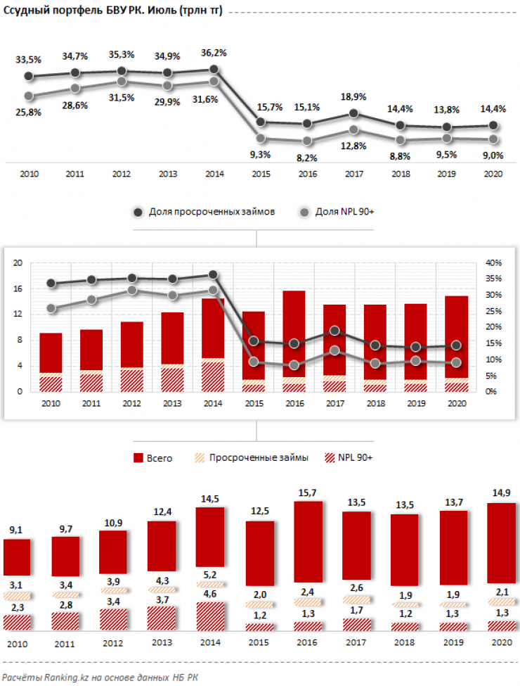 Так, суммарный ссудный портфель банков второго уровня в Казахстане сейчас равняется 14,85 триллиона тенге, что на 8,3 процента больше значений прошлого года, но на 0,9 процента меньше показателей прошлого месяца. В то же время число просроченных займов выросло на 9,6 процента за месяц и 13 процентов за год, что весьма пессимистично. Сумма просроченных платежей на момент отчета равна 2,1 триллиона тенге, или 14,4 процента от суммарного кредитного портфеля БВУ РК (рост к году +0,6 процента). В то же время уровень кредитов с просрочкой свыше 90 дней сократился на 0,4 процента за месяц. Сейчас только 9 процентов от ссудного портфеля имеют категорию NPL 90+. Годом ранее этот показатель составлял 9,5 процента и был ближе к максимально допустимой отметке в 10 процентов.