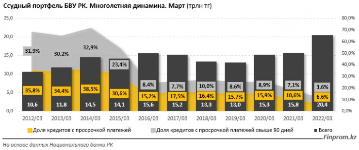В марте текущего года ссудный портфель БВУ РК увеличился всего на 0,7 процента, до 20,45 триллиона тенге. Половина банков из ведущей десятки ушла в минус по данному показателю.