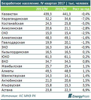 По итогам четвертого квартала 2017 года уровень безработицы сократился в семи регионах из 16 по РК.