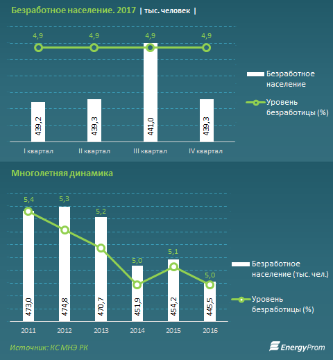 В то же время в многолетней динамике число безработного населения в последние годы в целом сокращается, хотя в кризисном 2015 году наблюдался новый скачок. Однако уже в 2016-м позитивная динамика выровнялась и продолжилась в прошлом году. Так, в четвертом квартале 2017 года в РК было 439,3 тысячи безработных - на 0,4 процента меньше, чем в аналогичном периоде годом ранее.