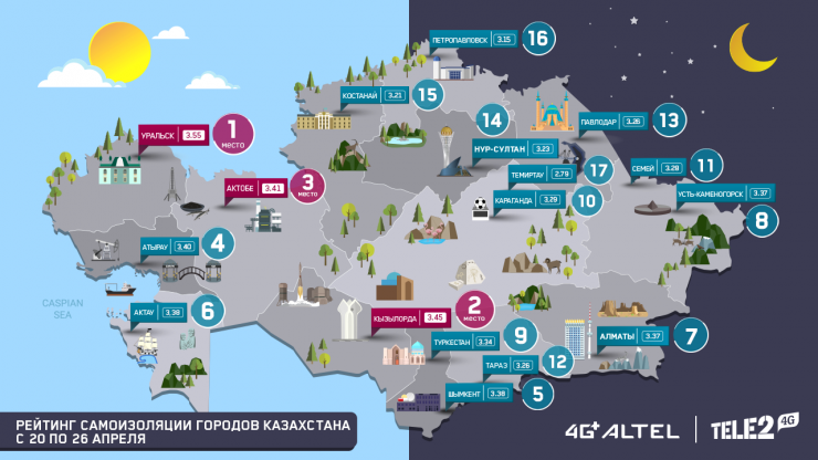 Tele2/Altel решил организовать очень необычный челлендж: соревнование между городами Казахстана по соблюдению режима самоизоляции. Города-победители будут определяться на основе собственного уникального рейтинга самоизоляции.