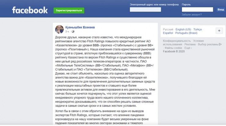 При этом глава правления АО "Казахтелеком" Куанышбек Есекеев в Facebook заявил, что оценка Fitch Ratings применима ко всей телеком-отрасли республики.