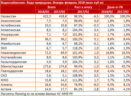 Поставки питьевой воды за январь-февраль 2018 составили 163,7 миллиона кубометров - на 2,4 процента меньше, чем в аналогичном периоде прошлого года. Это 38,8 процента от всей природной воды, обеспеченной водохозяйственными предприятиями по РК.