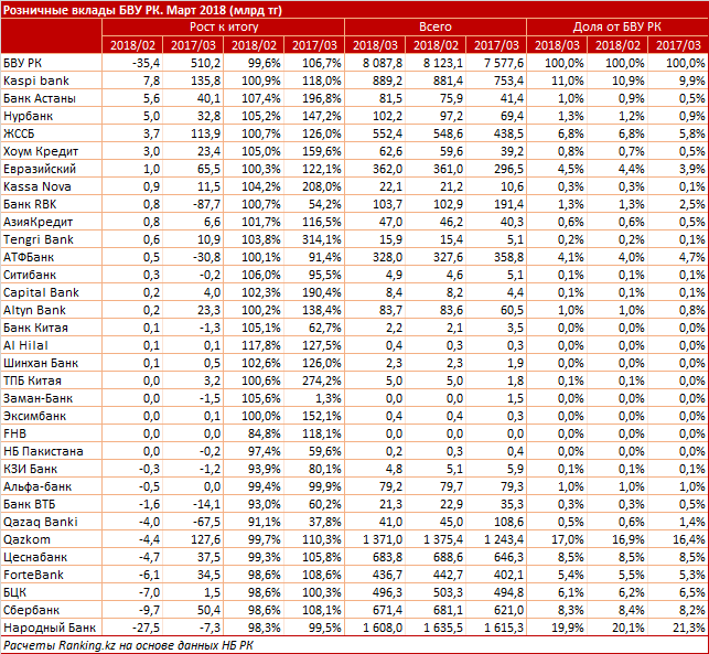 Лидировал Kaspi Bank с приростом на 7,8 миллиарда тенге (0,9 процента), до 889,2 миллиарда тенге. На втором месте по приросту шел Банк Астаны, у которого в марте месячный прирост составлял 5,6 миллиарда тенге (7,4 процента), до 81,5 миллиарда тенге.