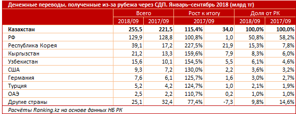 По данным Ranking.kz (по состоянию на сентябрь 2018 года), объем денежных переводов через СДП, полученных из-за рубежа, за январь-сентябрь 2018 года составил 255,5 миллиарда тенге, рост за год на 15,4 процента. По объему полученных из-за рубежа денег лидирует Российская Федерация, откуда было переведено 129,9 миллиарда тенге. Доля от РК при этом составила 50,8 процента. Следом идут переводы из Южной Кореи: 39,1 миллиарда тенге, рост в 2,3 раза. Доля страны выросла с 7,8 процента до 15,3 процента. Замыкает тройку лидеров Кыргызстан: 21,2 миллиарда тенге, рост за год на 59,6 процента. Доля страны выросла с 6 процентов до 8,3 процента.
