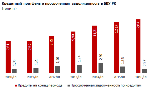 Кредитный портфель казахстанских банков второго уровня показывает непрерывный рост шестой месяц подряд. На конец января он составил 12, 844 триллиона тенге, увеличившись за месяц на 1,3 процента, за год - на 5,6 процента. При этом просроченная задолженность после небольшого роста в октябре-ноябре вновь вернулась на уровень ниже 1 триллиона тенге, или 7,5 процента от портфеля.