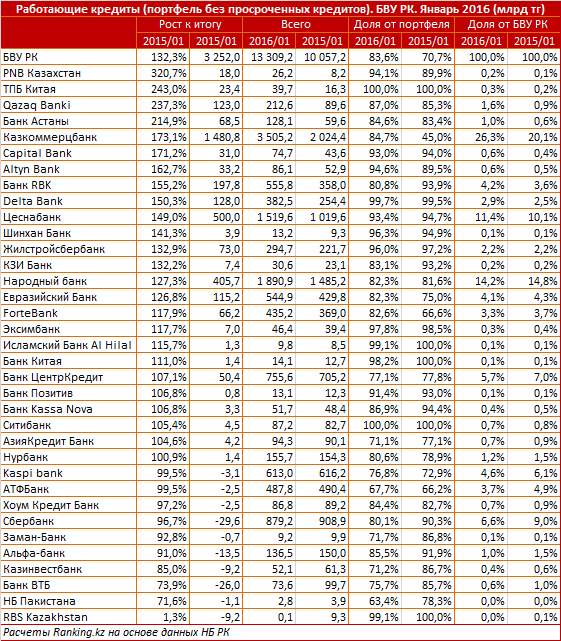 Из ТОП-10 банков, имеющих крупнейшие работающие портфели, самым быстрорастущим оказался лидер рынка, Казкоммерцбанк, отмечают аналитики Ranking.kz. За счет присоединения БТА и избавления от проблемных активов ККБ за год увеличил портфель на 73,1 процента. В полтора раза выросли показатели Bank RBK и Цесна Банка. Народный и Евразийский прибавили по 27 процентов, ForteBank - 18 процентов.