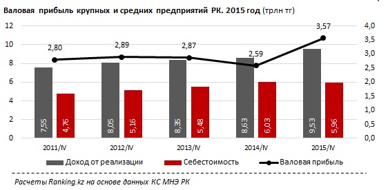 По информации аналитиков, выручка крупных и средних предприятий Казахстана в 2015 году составила 9,53 триллиона тенге - на 10,5 процента больше, чем годом ранее. В то же время себестоимость произведенной продукции и услуг снизилась на 1,2 процента - до 5,96 триллиона. Благодаря этому валовая прибыль поднялась сразу на 37,8 процента - до 3,57 триллиона тенге.