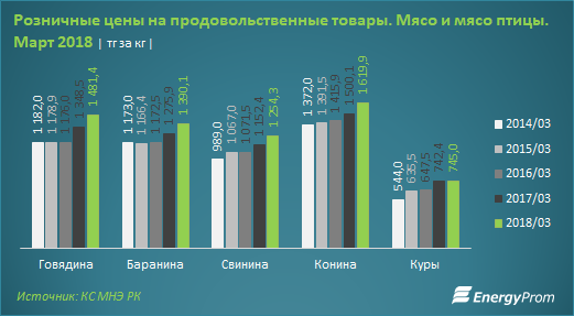 Казахстанцы вынуждены платить все больше за мясо. Сильнее всего год-к-году подорожала говядина - сразу на 9,9 процента, до 1 481 тенге за килограмм. Баранина выросла в цене на 9 процентов, до 1 390,1 тенге за килограмм. Свинина и конина подорожали на 8,8 процента, до 1 254,3 тенге, и 8 процентов, до 1 619,9 тенге, соответственно.