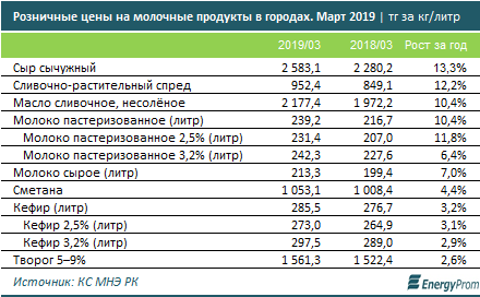 В то же время сыр подорожал за год сразу на 13,3 процента, до 2 583,1 тенге за килограмм; сливочно-растительный спред - на 12,2 процента, до 952,4 тенге за килограмм; сливочное масло - на 10,4 процента, до 2 177,4 тенге за килограмм; пастеризованное молоко - на 10,4 процента, до 239,2 тенге за литр.
