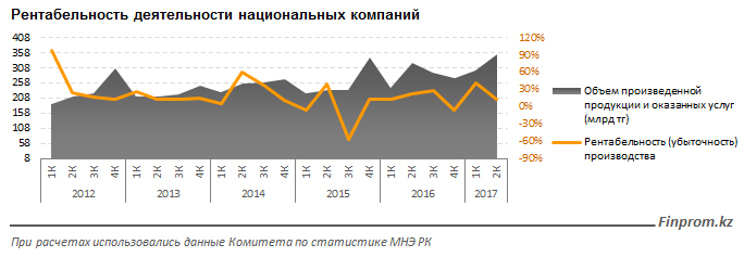 Также сообщается, что рентабельность производства товаров и оказания услуг нацкомпаниями за второй квартал 2017 года снизилась до 13,8 процента с 40,9 в предыдущем квартале. Итоги апреля-июня текущего года оказались ниже и показателей 2016 года - прибыльность деятельности нацкомпаний за второй квартал прошлого года сложилась на уровне 22,2 процента.