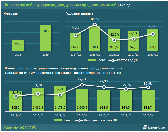 К началу 2019 года в Казахстане было зарегистрировано 999,7 тысячи индивидуальных предпринимателей - всего на 0,6 процента больше, чем в 2018 году. Для сравнения: в 2013-2015 годах их было более миллиона.