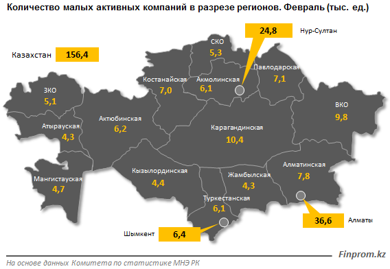 Среди регионов самое большое количество малых активных компаний работает в Алматы: 36,6 тысячи - на 14,8 процента больше по сравнению с февралем 2018 года. На втором месте столица, где их количество выросло сразу на 40,4 процента за год, до 24,8 тысячи. В Карагандинской области, замыкающей тройку лидеров, количество малых активных компаний составило 10,4 тысячи - на 1,6 процента меньше, чем в прошлом году.