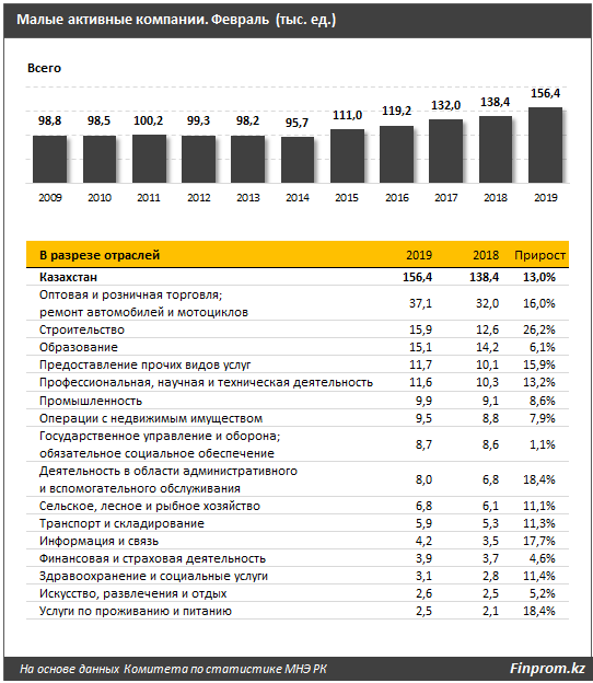 Самый большой за февраль 2019 года прирост малых компаний произошел в сфере строительства, торговли и ремонта автомобилей и мотоциклов и деятельности в сфере администртативного и вспомогательного обслуживания. Об этом сообщается в исследовании Ranking.kz, передает Tengrinews.kz.