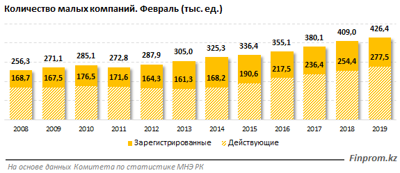 Количество зарегистрированных малых компаний в РК за год выросло на 4,3 процента и составило на конец февраля 2019 года 426,4 тысячи. 277,5 тысячи из них - действующие, что на 9,1 процента больше, чем в феврале 2018 года.