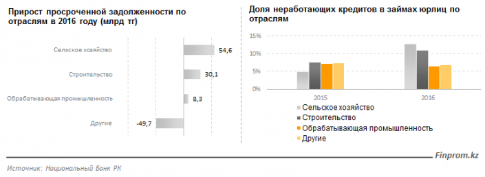 За год размер просрочек организаций, работающих в сельском хозяйстве, вырос на 54,6 миллиарда тенге. Это почти в 3 раза больше, чем было в начале года. В результате к концу 2016 года порядка 13 процентов всех кредитов в отрасли являлись неработающими.