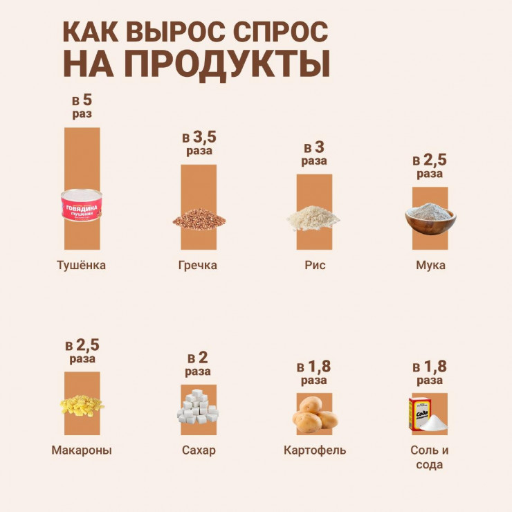 Оказалось, что среди продуктов безусловно лидирует тушенка. Ее в последние две недели покупали в 5 раз больше, чем обычно. Все-таки в нашей традиции основой питания является мясо. А уж потом гречка, рис и мучное.