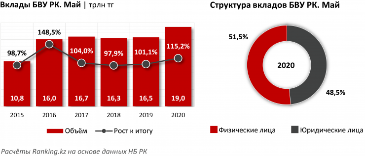 В топ-5 БВУ также вошли Жилстройсбербанк (+24,1%, до 953,1 миллиарда тенге) и Сбербанк (+20,6%, до 1,7 триллиона тенге). В совокупности эта пятерка банков увеличила депозитную базу на 1,4 триллиона тенге.