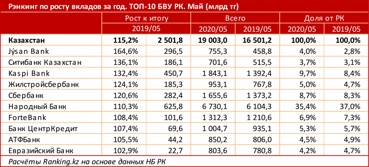 Вторую строчку по росту вкладов занял Ситибанк: +36,1% за год, сумма вкладов достигла 701,6 миллиарда тенге. Замыкает тройку лидеров по росту вкладов среди десяти крупнейших банков страны Kaspi Bank: +32,4% за год, до 1,8 триллиона тенге.