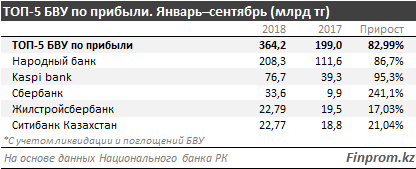Наибольшую прибыль на конец сентября 2018 года фиксирует Народный банк, сумма составила 208,3 миллиарда тенге. Народный нарастил сумму прибыли на 86,7 процента год-к-году.