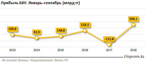 На конец сентября 2018 года прибыль банков Казахстана составила 506,1 миллиарда тенге. Это максимальное значение за последние пять лет, передает Tengrinews.kz со ссылкой на Finprom.kz.