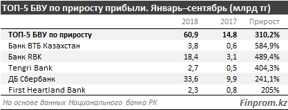 Вторую строчку по темпам роста прибыли занял Банк RBK - прирост почти в 6 раз год-к-году (18,4 миллиарда тенге).