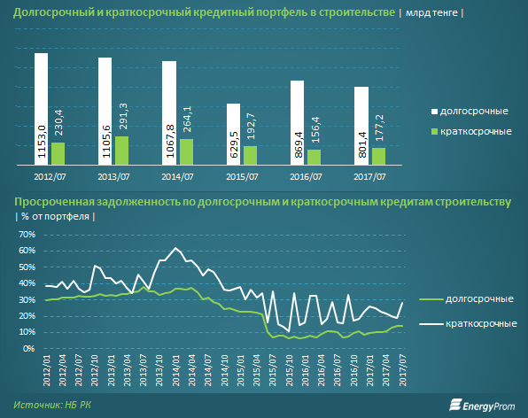 Основной темой для беспокойства кредиторов аналитики назвали растущую просрочку по длинным кредитам в отрасли. За семь месяцев текущего года доля неработающих кредитов в долгосрочном портфеле выросла с 8,7 процента до 13,7 процента. На этом фоне выдача длинных кредитов стройкомпаниям была заморожена, объем портфеля таких ссуд за год сократился на 7,8 процента до 801,4 миллиарда тенге.