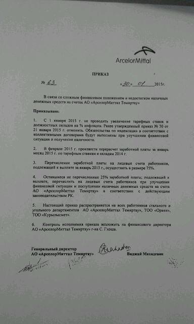 "Иностранным специалистам заработная плата была выплачена в размере 50 процентов. Работникам стального и угольного департаментов АО "АрселорМиттал Темиртау", ТОО "Оркен" и ТОО "Курылысмет" заработная плата за январь 2015 года будет выплачена в размере не менее 75 процентов. Оставшийся процент подлежащей к выплате заработной платы будет перечислен на лицевые счета работников по мере поступления наличных денежных средств на счета АО "АрселорМиттал Темиртау". Также решено отложить увеличение тарифных ставок и должностных окладов работников компании на процент инфляции. Обязательства по индексации в соответствии с коллективным договором будут выполнены при улучшении финансовой ситуации и получении компанией наличных средств", - пояснили в компании.