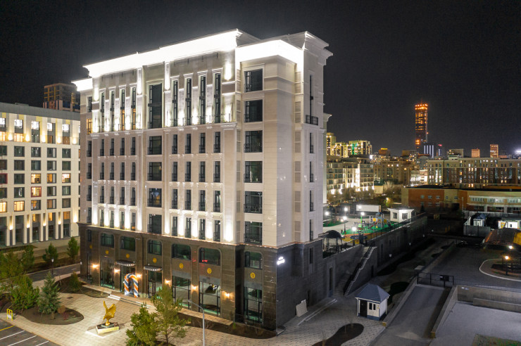 Столица продолжает поиск идеальной "одежды" для дома. Одно из лучших решений - примененный полимербетон. Он легче фибробетона в четыре раза, при этом негорючий и обладает отличными качествами для нашего резко континентального климата. Фасад смонтирован на металлической подконструкции, которая не сжимается и не расширяется под воздействием температуры.