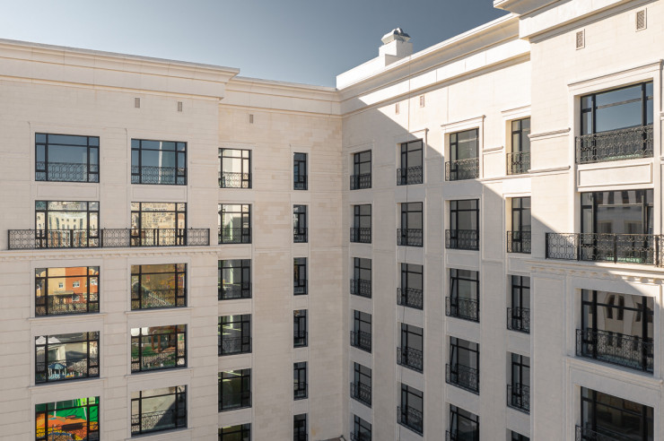 Каждая деталь подчеркивает высокий статус дома. Мрамором отделаны все этажи, 32-рожковые люстры в фойе, помимо круглосуточной охраны и видеонаблюдения, работает консьерж. Высота потолков – 3,25 метра.