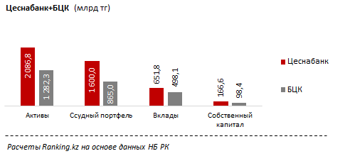 Цеснабанк и БЦК входят в ТОП-10 банков второго уровня по объему активов. Цеснабанк расположен на третьем месте, объем активов составляет 2,1 триллиона тенге, БЦК - на шестом месте с 1,3 триллиона тенге активов. После их слияния объем активов может составить 3,4 триллиона тенге, что позволит ему занять второе место по данному показателю после пары Народный+Казком и оторваться от ближайшего конкурента более чем в два раза. Доля от БВУ РК составит 13,5 процента. Тогда на долю объединенного банка придется 16,3 процента кредитов и 15,1 процента вкладов от БВУ РК.