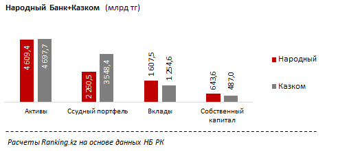 Казком и Народный - крупнейшие банки РК, по объему активов они занимают первое и второе места соответственно, отмечают аналитики. На конец февраля портфель активов Казкома составлял 4,7 триллиона тенге, у Народного - 4,6 триллиона тенге.