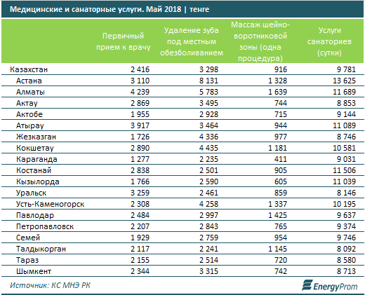 По итогам мая стоимость первичного приема у врача составляла 2,4 тысячи тенге, на 8,4 процента дороже, чем годом ранее. На 7,6 процента выросли в цене услуги стоматологов (удаление зуба) - до 3,3 тысячи тенге.